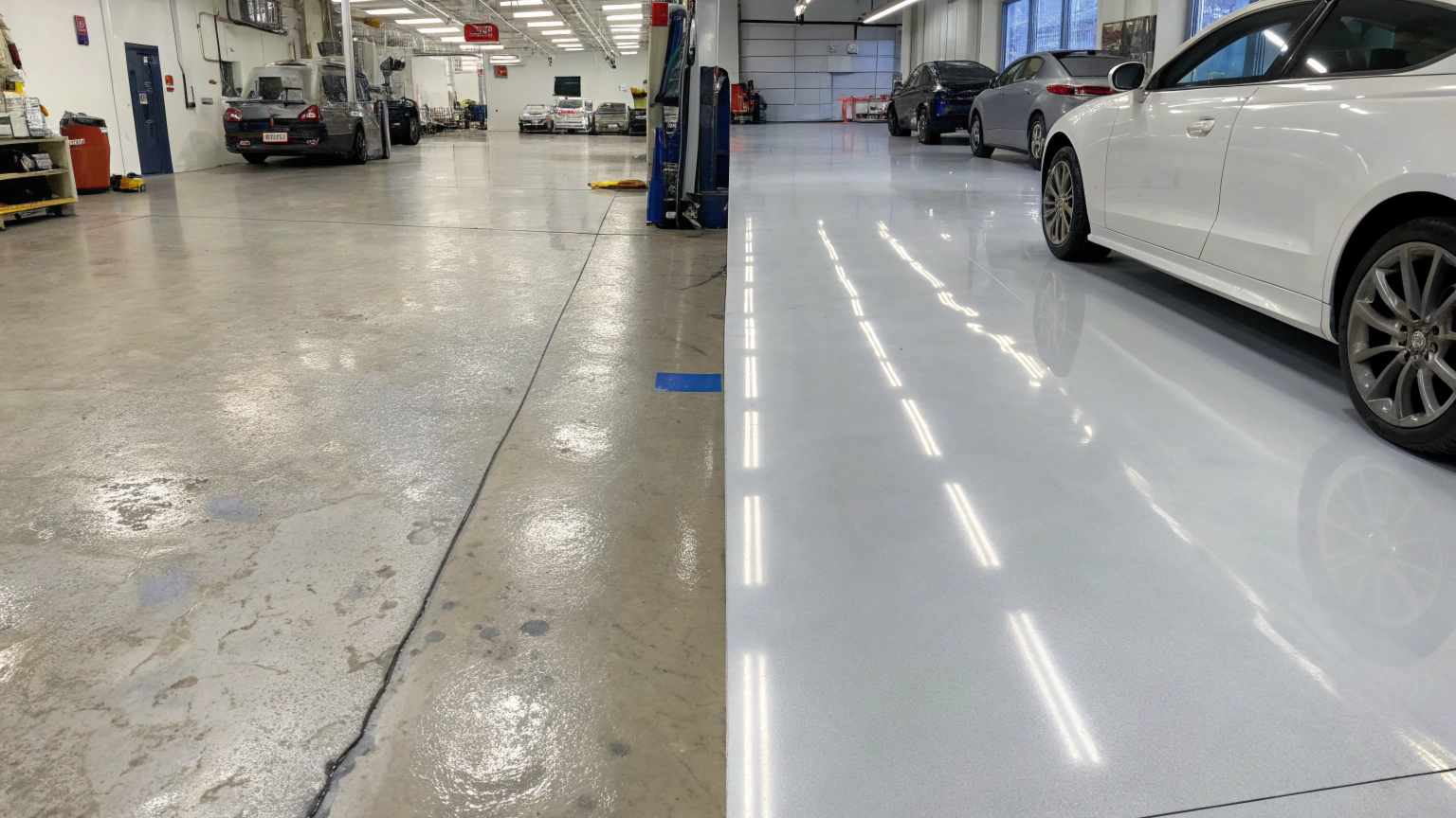 Chemical exposure, dropped tools, and machinery movement damage clear coats over time. Restoration provides renewed chemical resistance and easier cleaning.